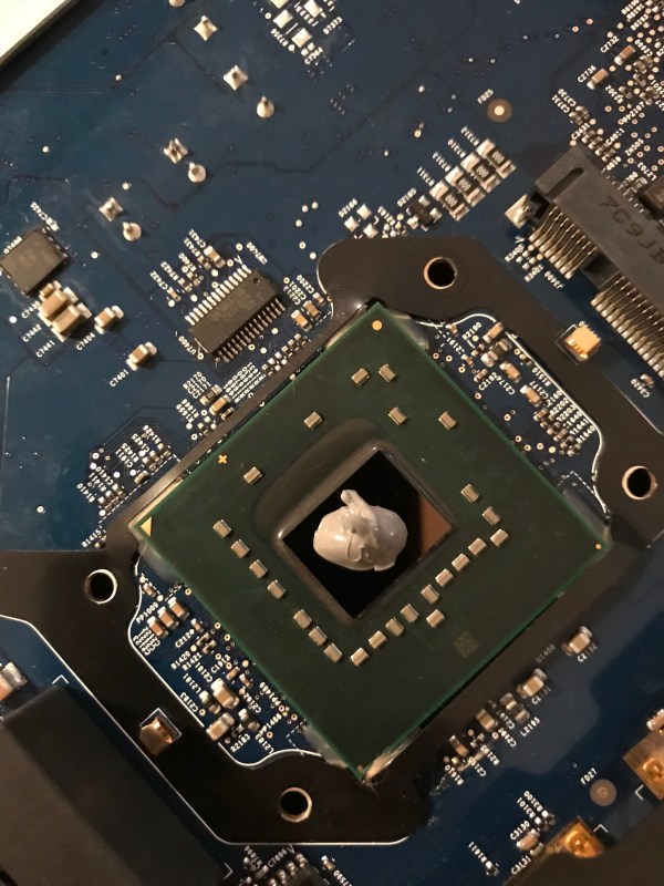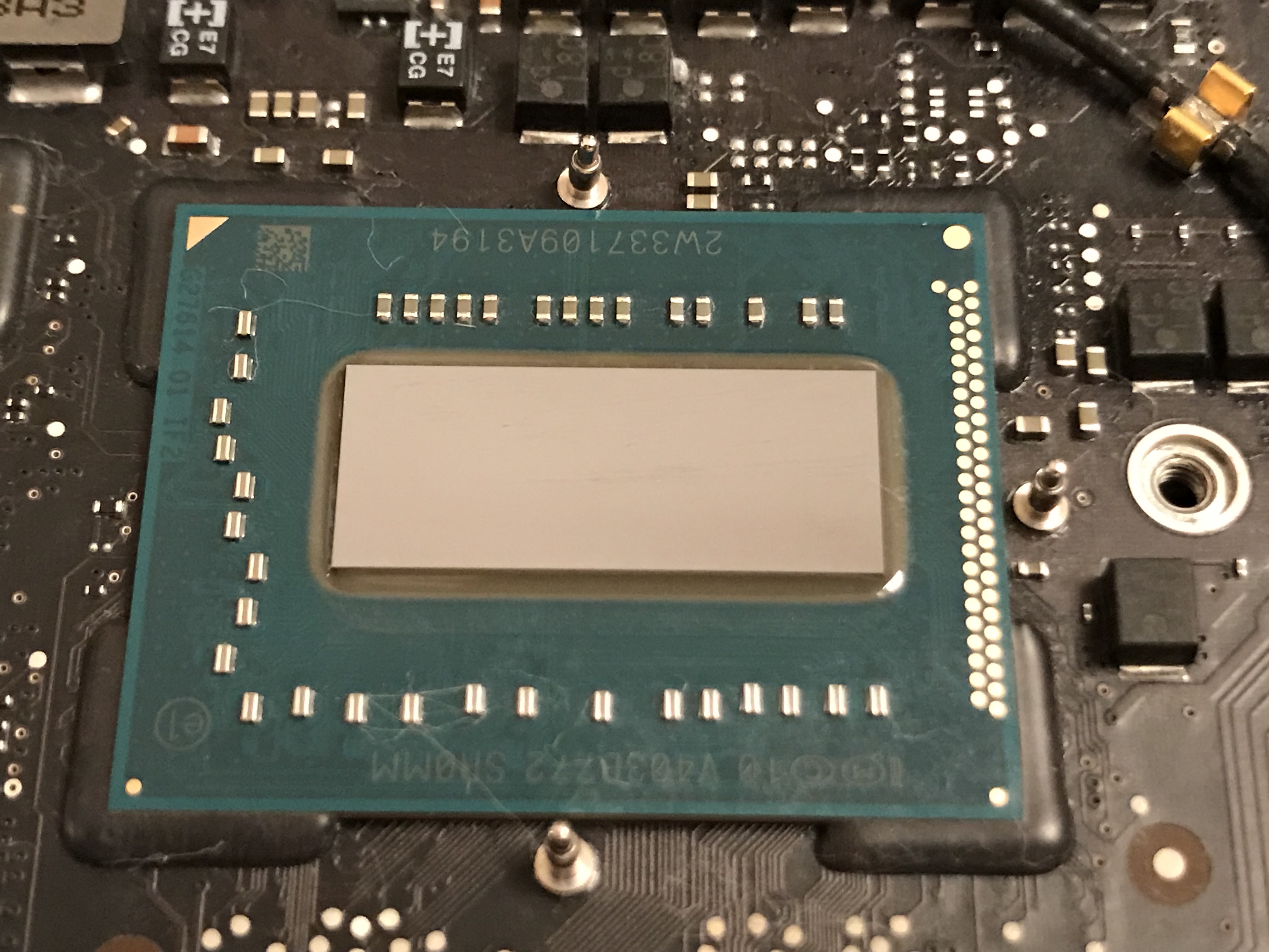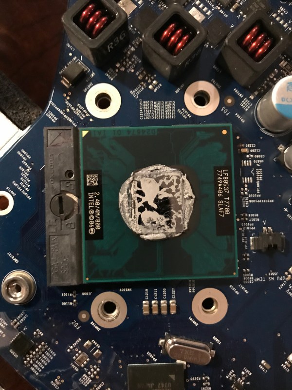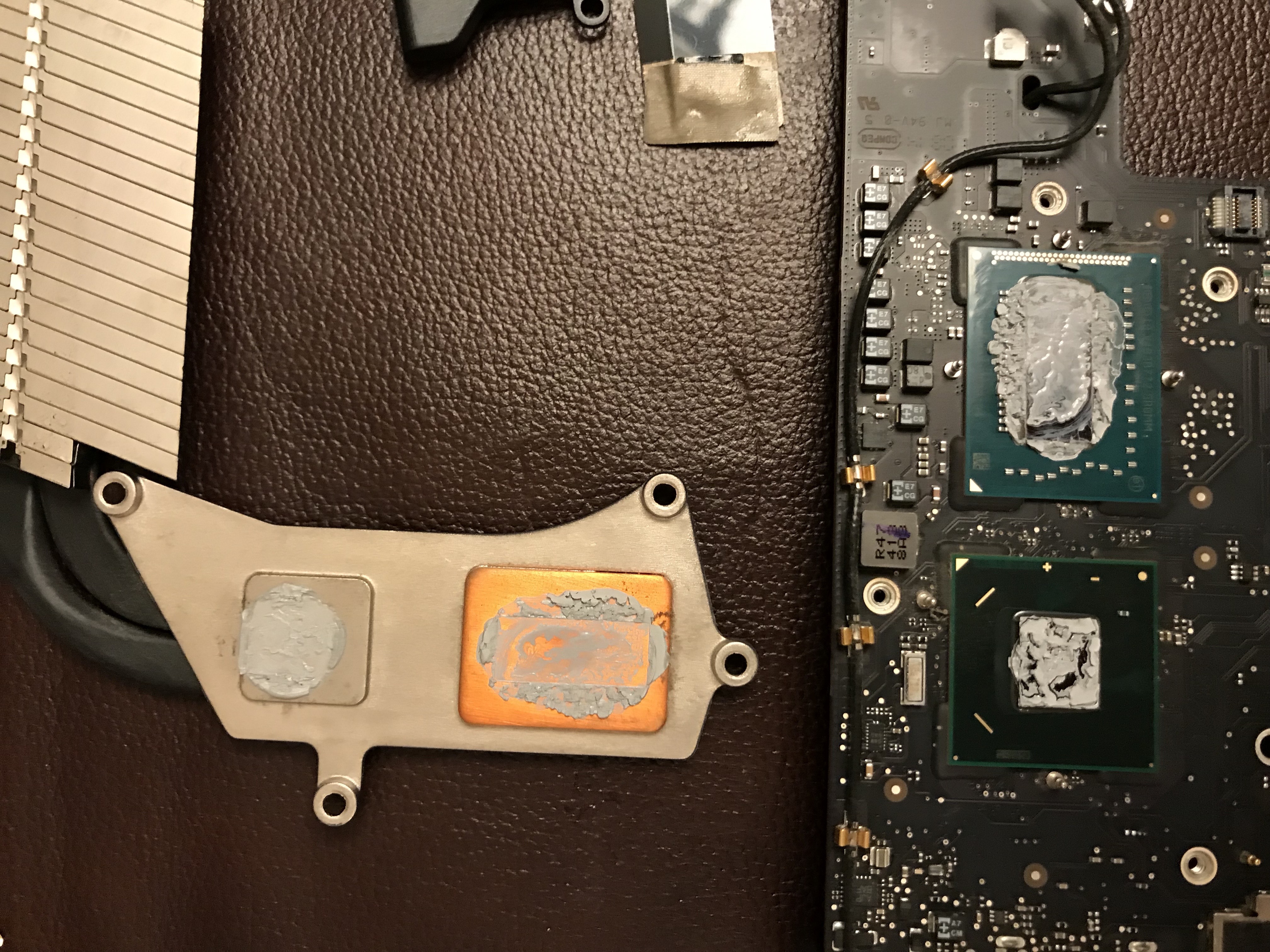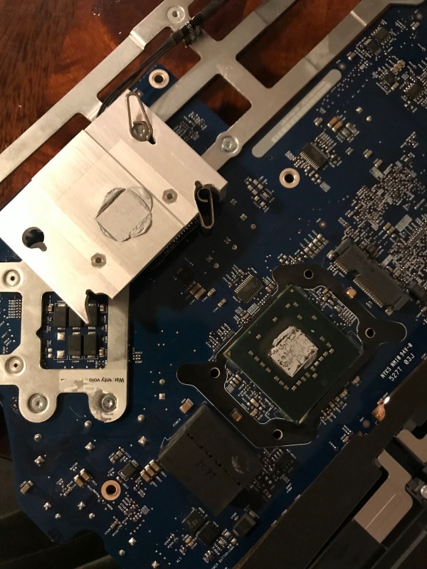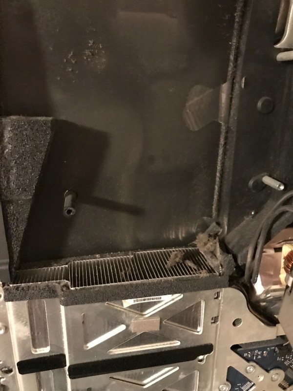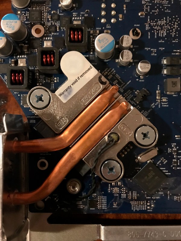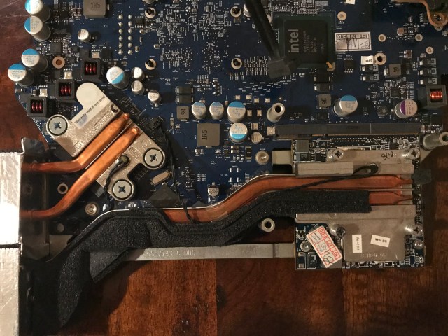 In the meantime I wanted my computer up and running, so that same night, I took the risk and re-assembled the heatsink with only three working screws. I knew I was running the risk of overheating due to an uneven heat transfer between the chip and the heatsink, but I also suspected the chip had some sort of heat management logic built in, and would probably run at a slower clock speed if it saw a heat spike. Indeed, that’s what happened: my iMac was a little bit slower in the interim.