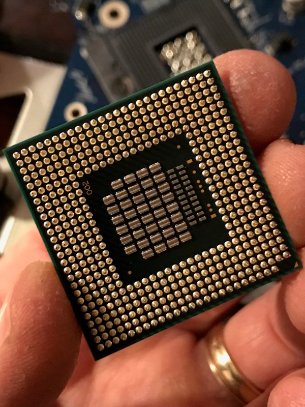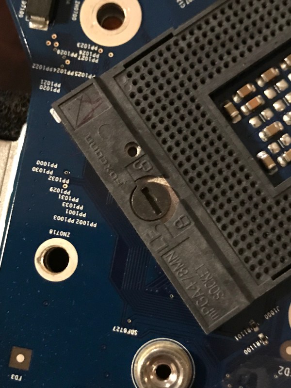 I take everything apart and now, not only are those damned little connectors in the socket once again bent in weird ways, but the corners of the CPU are bent, because it was pushed down into the socket by the heatsink after it came loose from its precise slot during re-assembly. If you’re delicate, you may want to skip over the rest of this paragraph. What the hell was I to do? I had nothing to lose. I didn’t know if the CPU would work again, so I took some needle-nose pliers and carefully straightened the corners. Thankfully, there’s a literal safety margin built into the edges of the chip, with no visible circuitry there, just the fiberglass backing (I think). Then I set about re-straightening the little connectors. You would not have wanted to be near me when I did that. So much cussing… I was too busy cussing to take any photos of this step of the process.