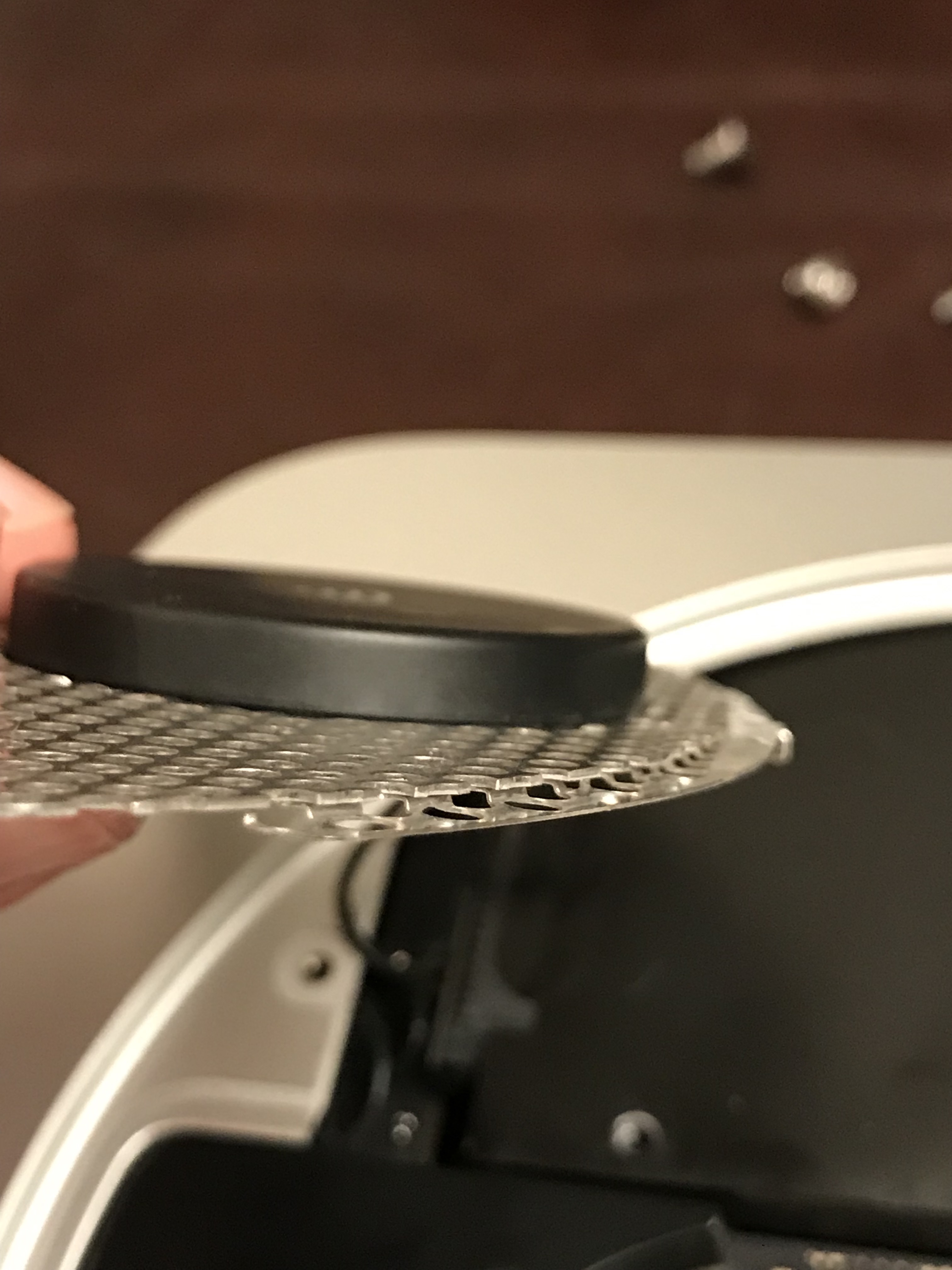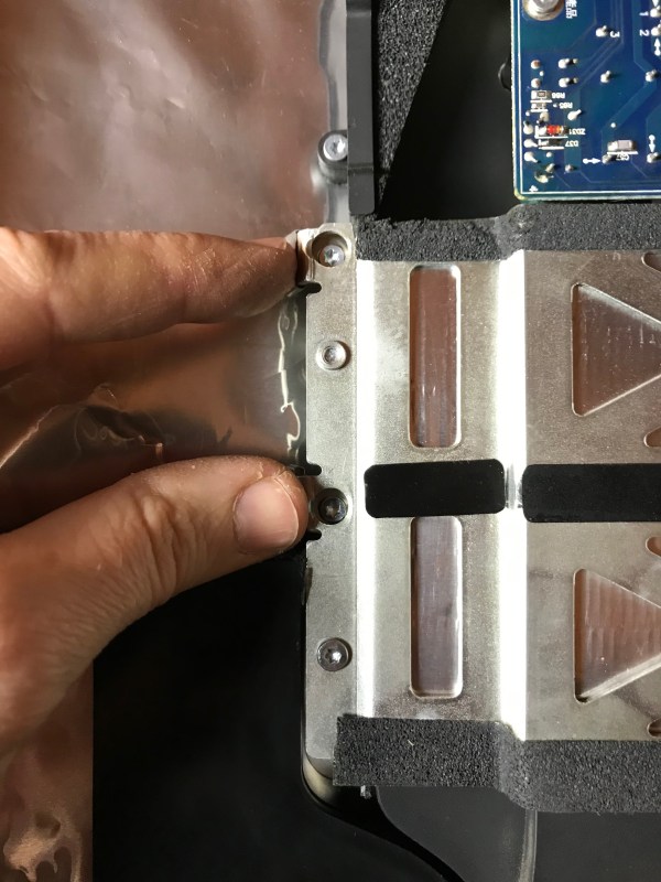 First, there’s adhesive tape that must be removed, all around the perimeter of the display, while being very careful not to mess with the display wiring harnesses. Also, there are a great many tiny screws, all around the perimeter of the display, that must also be removed. Once that’s done, the metal backing of the display comes off, revealing a stack of plastic sheets of differing transparencies and textures that make up the actual display assembly. Don’t ask me how it works that way. I don’t know. But I do know dust had somehow gotten in there, in-between those plastic sheets, and I needed to clean it off.