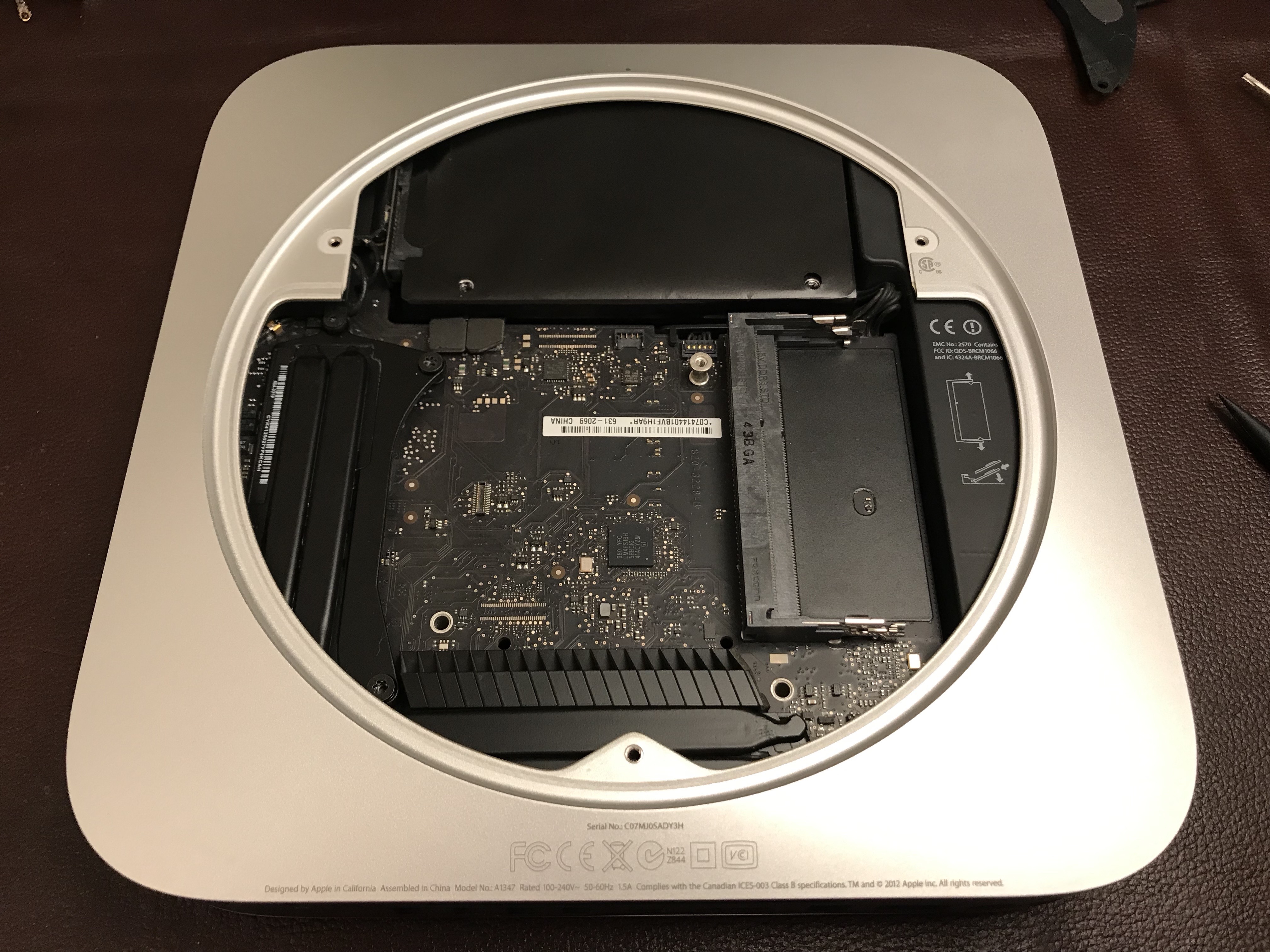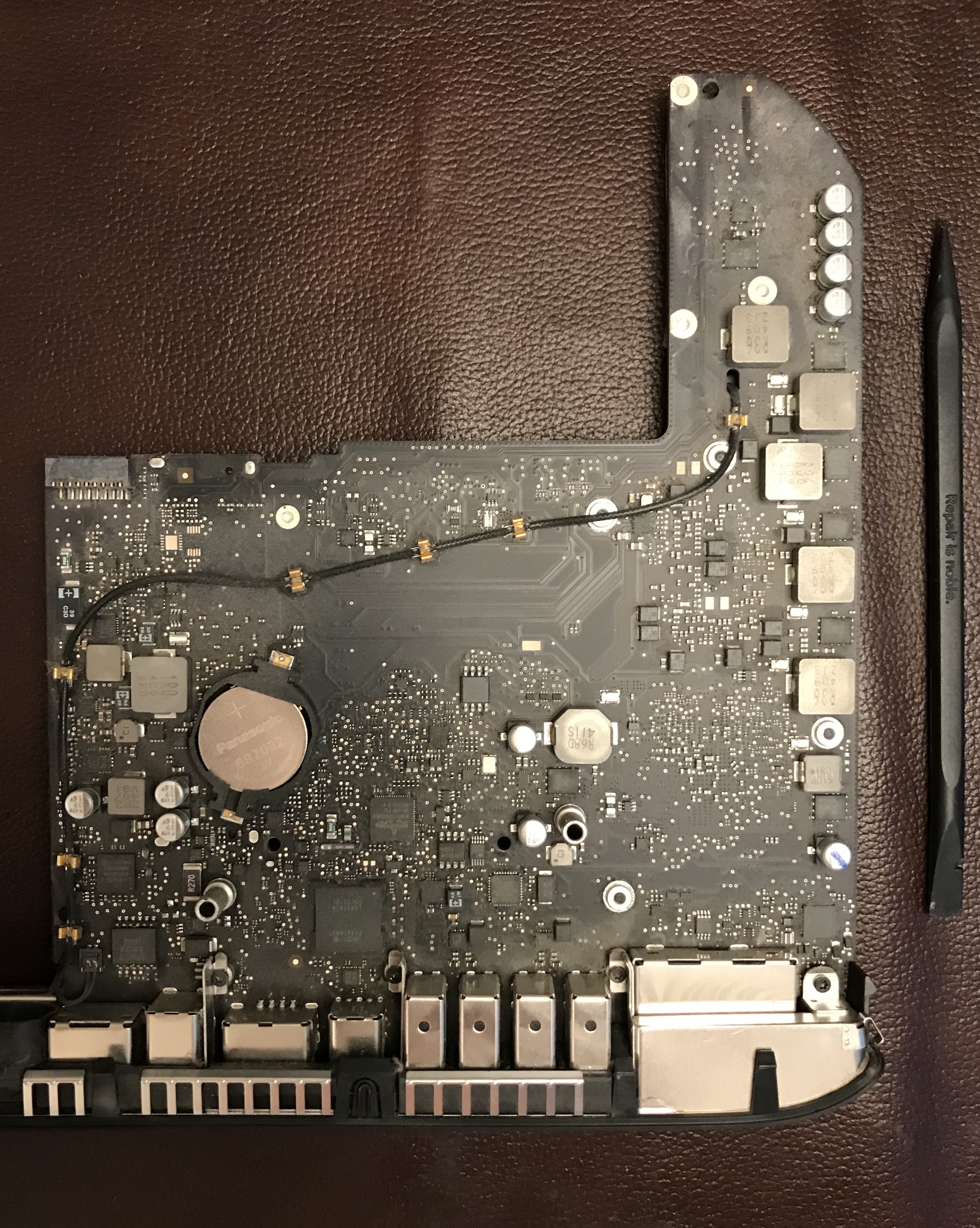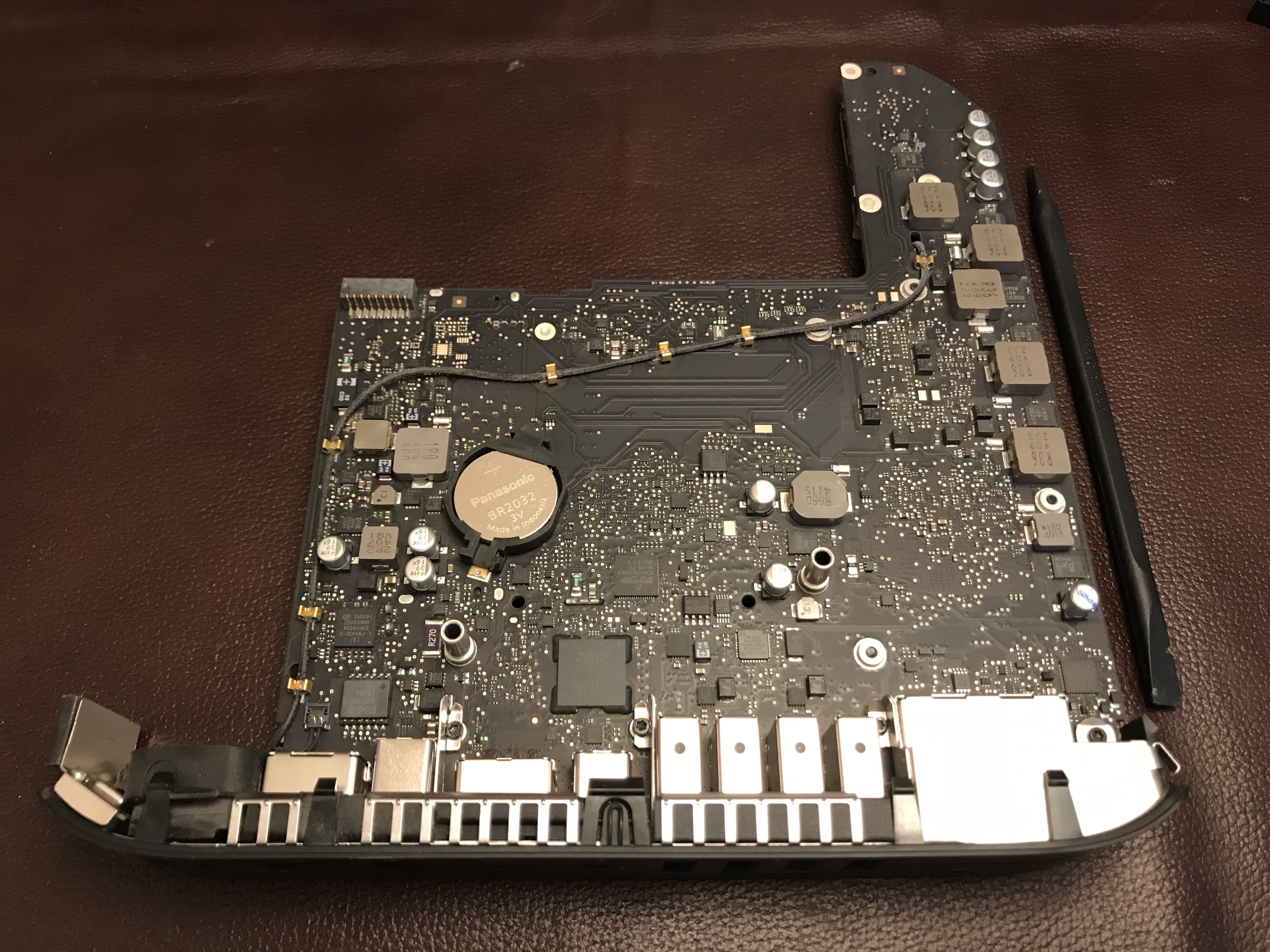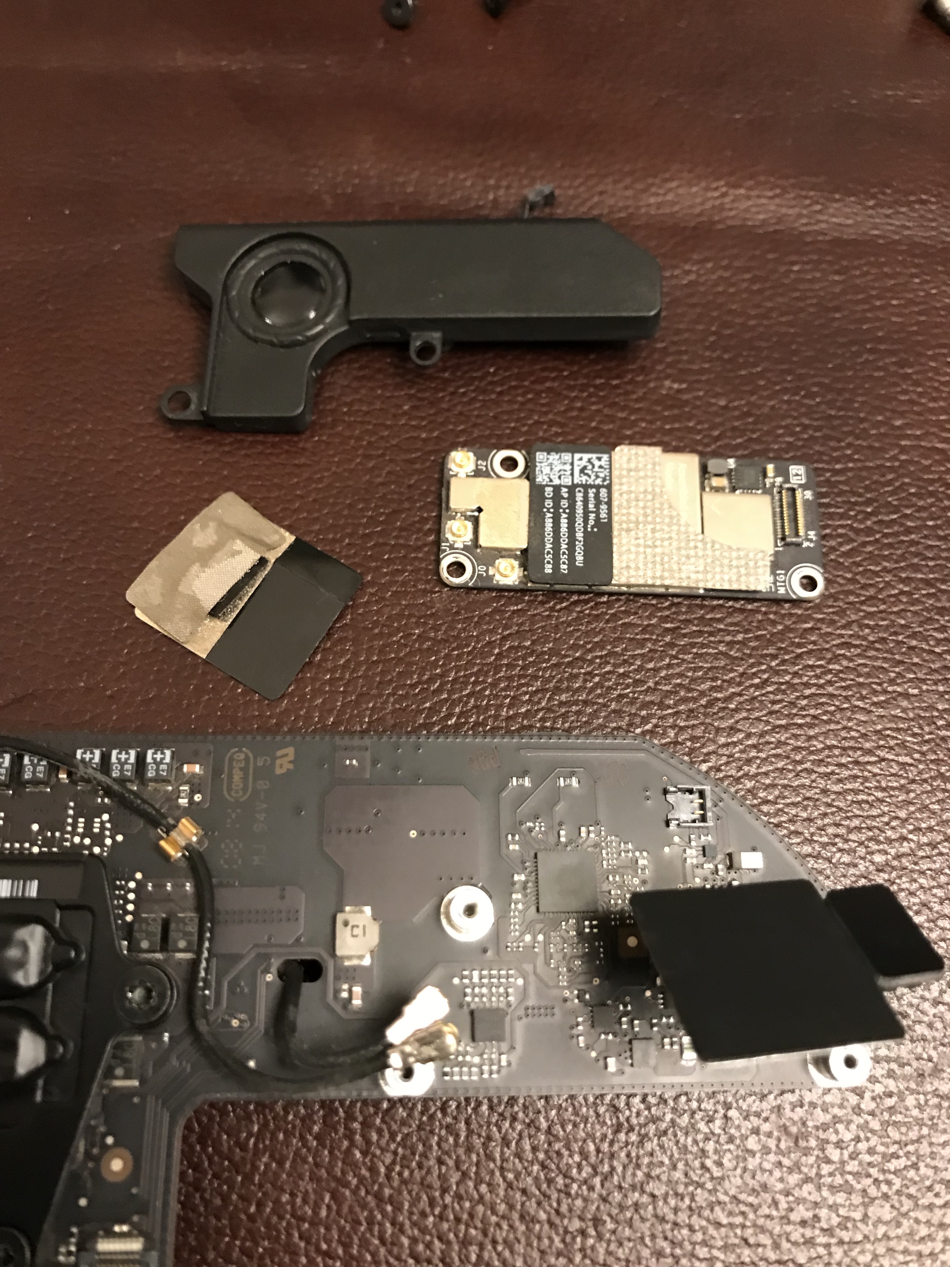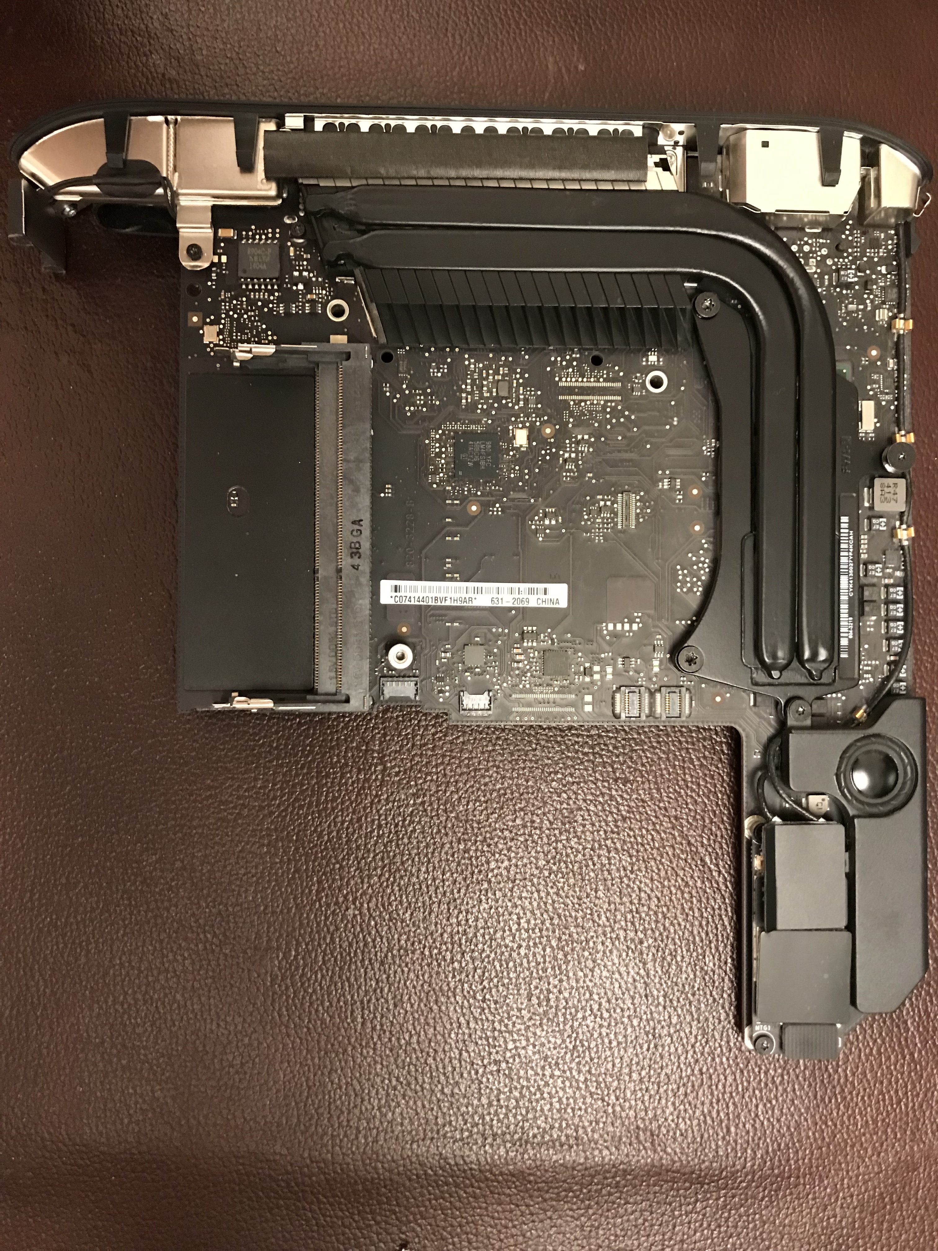 Off came the NVME card and its adapter. Now you can have a proper look at that supposed metal mount for the Apple SSD, which on this iMac is simply set with adhesive on the motherboard. As I said previously, it’s a design flaw, more like an afterthought. There are circuits on the other side of the motherboard going right under the mount, so there’s no way they could have put a proper mount with a flange there. The application of the adhesive was cleaner from the factory, but when I worked on it things got messier.