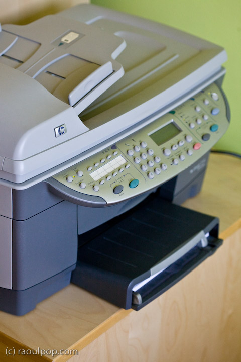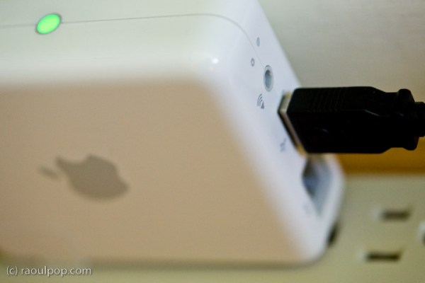 The cover for the dock is easily removed, and the really nifty thing is that HP designers included a slot at the back end of the dock for the printer wires (USB, power). That way, you can slide them right through the case and out the back, easily connecting the printer to the computer and the power supply. Very, very nice! For example, I used the dock to sit my wireless antenna in it, and I slid the antenna cable through the very same slot, pulling it out through the back of the case, as you can see below.