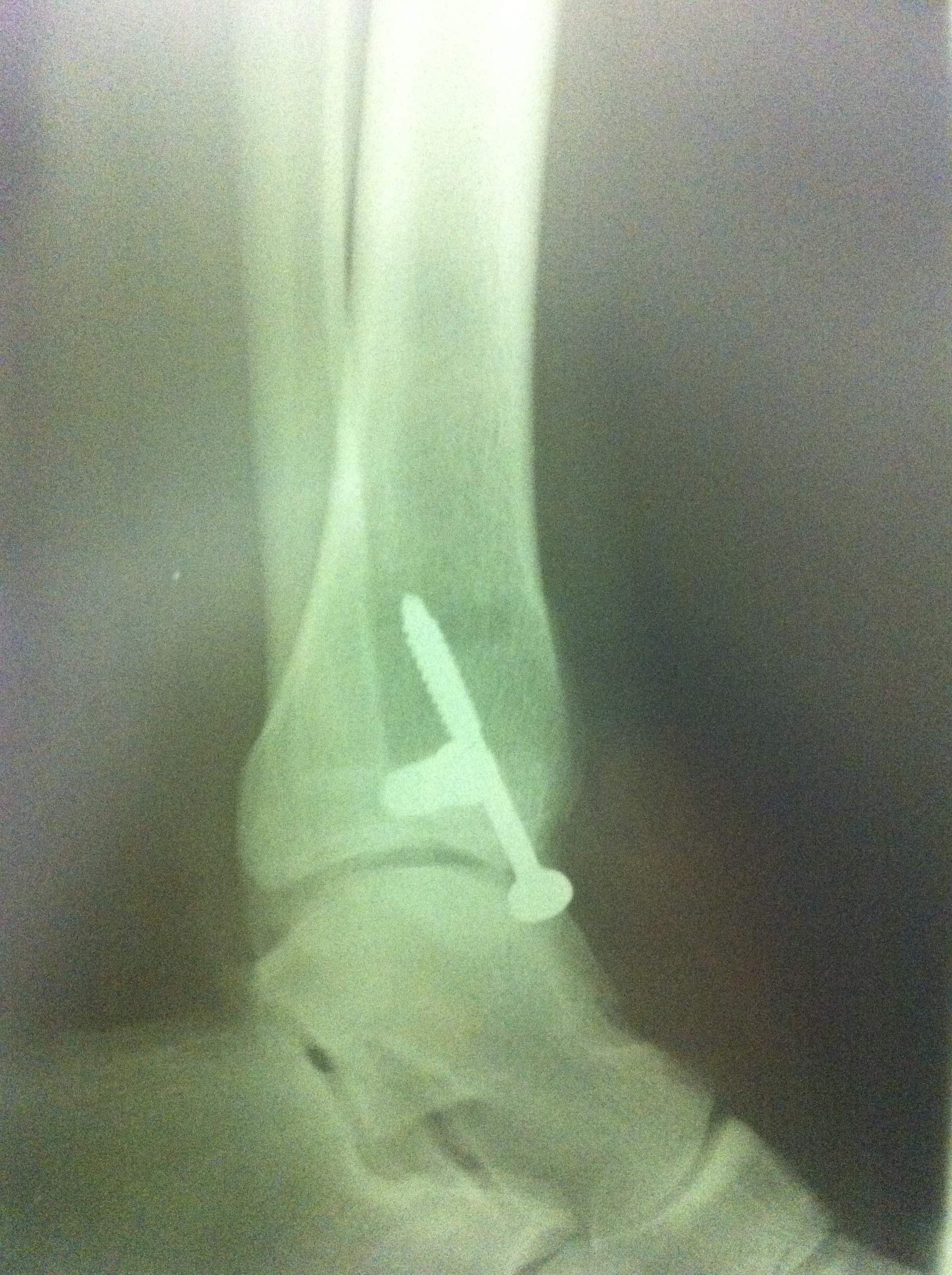 From September to the end of October, I made great progress. My muscles started remembering their previous size and began to grow again. I was on my way to wonderful results, sooner than expected, until an unexpected injury sidelined me, right at the start of November. This was completely unrelated to bodybuilding. We were doing renovations at home, and the workmen had dug a trench in the garden to lay some new pipes. They forgot to tell me. We came back home at night from an out-of-town trip, I took a walk through the garden in pitch black darkness and fell right in. It was a strange feeling, stepping into a void… When my foot hit bottom, I heard a terrible crunch and then the excruciating pain began… The force of the impact pulled on my ankle ligaments so much that it fractured both the tibula and the fibula at their ends. (The medical term is bimalleolar fracture.) It snapped one of them clean off and the other managed to hang on. Let’s just say I have a nice zipper-shaped scar on my ankle and a couple of extra titanium screws in there. I’m thankful that the ligaments didn’t tear, because the recovery would have been more painful and would have lasted longer. Here’s the x-ray after surgery.