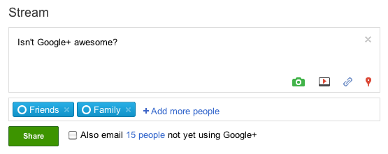 I like that you can’t auto-publish feeds to Google+, because it makes it harder for spammers to pollute the service. All of the input is manual, which means you have to physically be there and type it in. It does mean a bit of extra work after you’re written a blog post and want to share it. Perhaps some middle ground will be reached in the future, where blog posts, photos and videos will be automatically brought in.