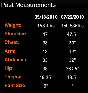 I didn’t measure my body when I started. I really should have. It would have been great to see my progress that way. All I can tell you is that my weight is up a bit since the last time; it’s now at 187 lbs. Not a big increase but then only I know how busy I’ve been and how little I’ve eaten. Most days I got 2-3 proper meals when I should have eaten five. Such is life when you take on too much. I’ll tell you one thing though: doing renovations on your house as you live in it and also having to act as the general contractor for said renovations is a pretty surefire way to go cuckoo, especially when you need quiet time to work on your business and your other projects.