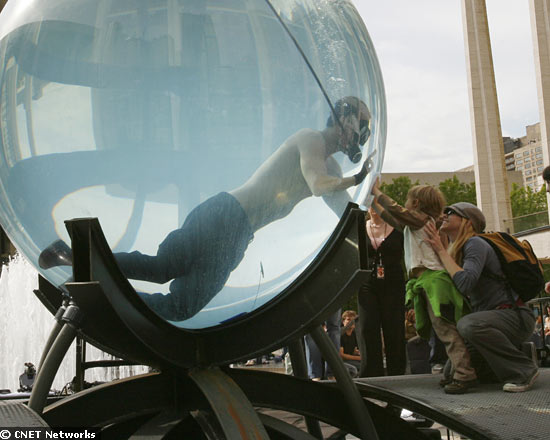 Now he’s in an eight-foot acrylic sphere at New York’s Lincoln Center, and he wants to stay fully submerged in the water for up to a week. He’s planning to break out on Monday, after beating the world record on holding one’s breath underwater, all while tied up with 150 lbs. of chains and handcuffs. One might say he’s asking for trouble. He’s also reported having problems with his skin because of the continued submersion.