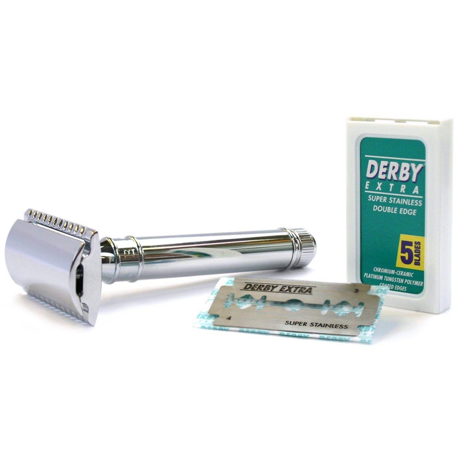 This traditional double edge safety razor is fitted with the latest precision manufactured Edwin Jagger DE razor blade head creating great interest among experienced wet shavers requiring a close and accurate wet shave with finished results comparable to the original straight cut throat razor. The classic closed comb head, expertly engineered caps the highly polished chrome plated solid brass tubular handle with the Edwin Jagger name embossed around the collar. With an Edwin Jagger traditional double edge safety razor you can achieve a very close shave helping to reduce ingrowing hairs. Each DE razor is supplied with 5 Derby safety blades so the razor is shave ready.