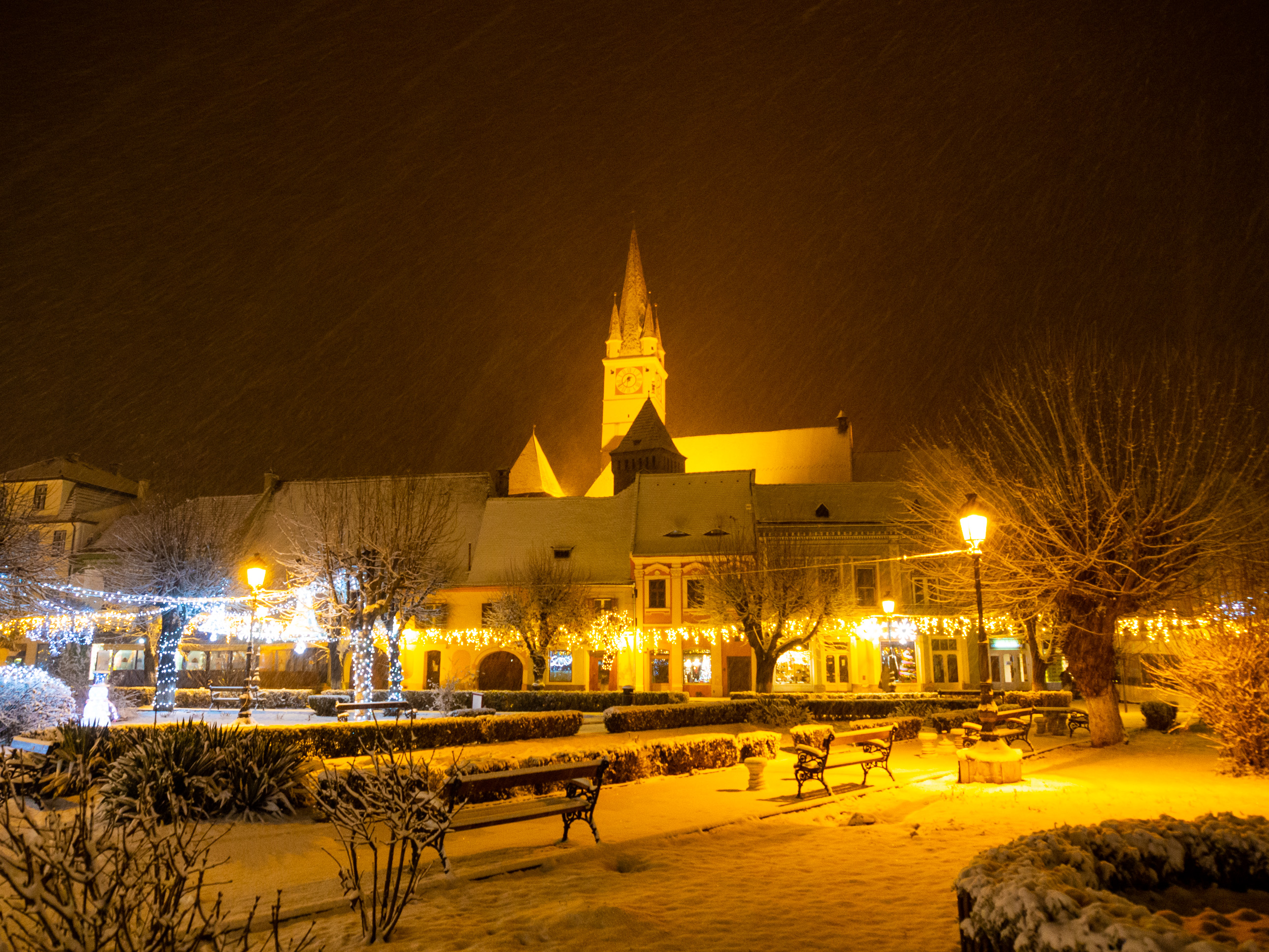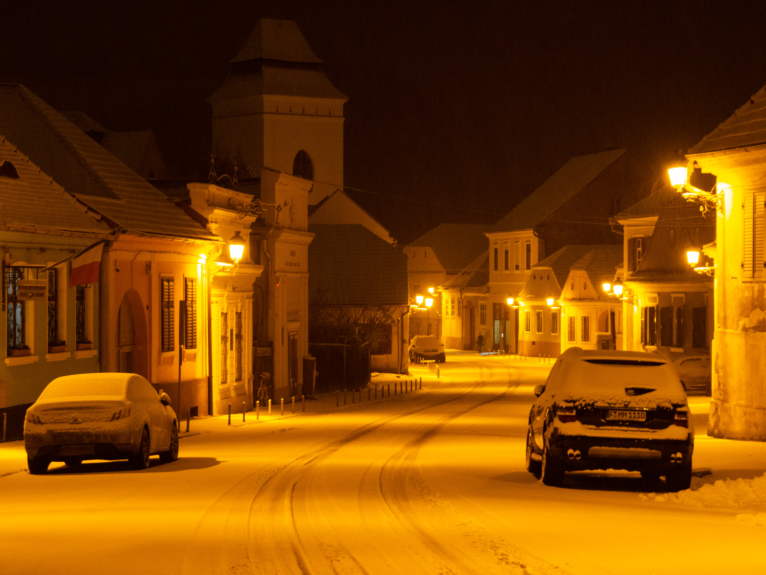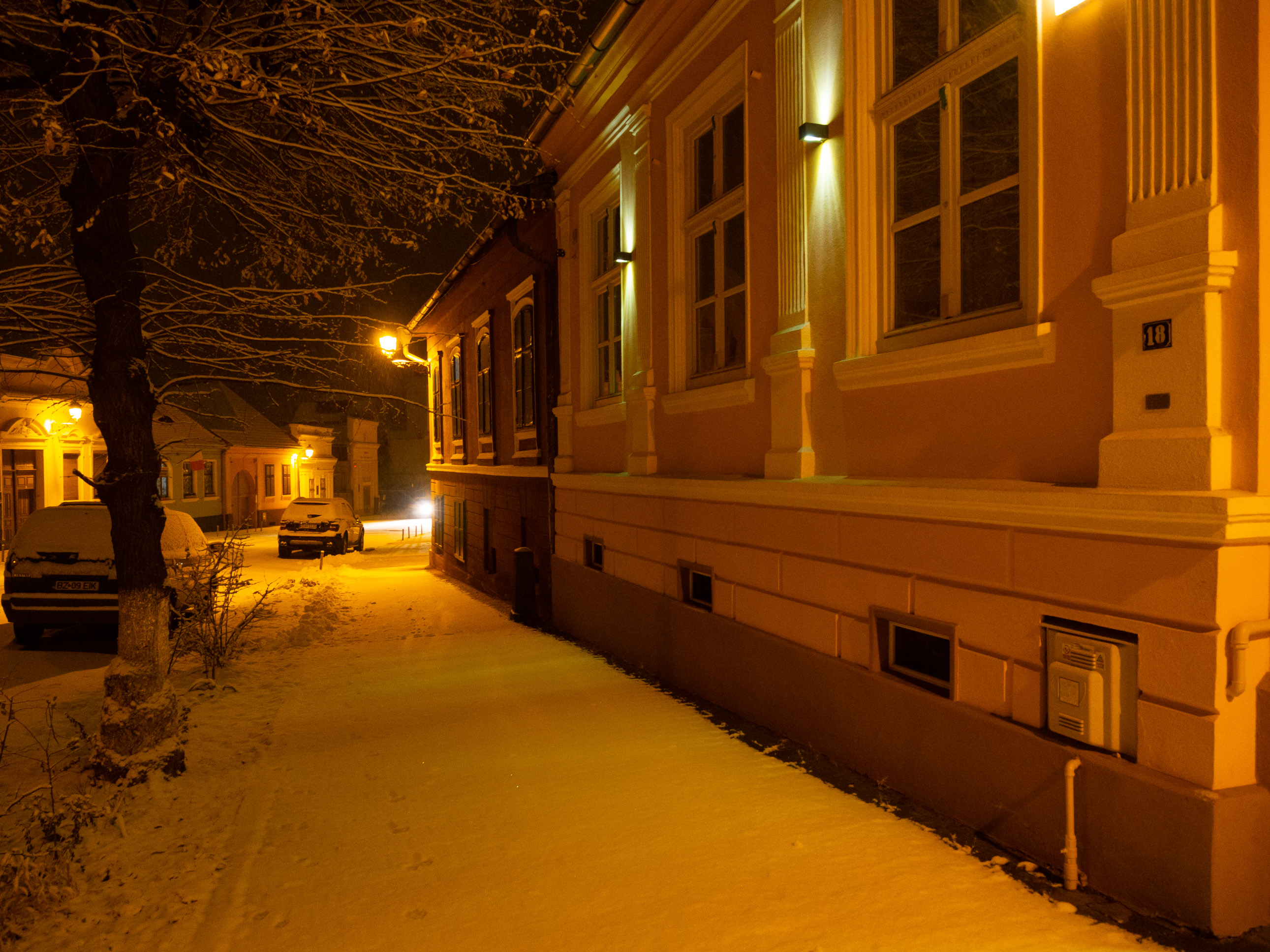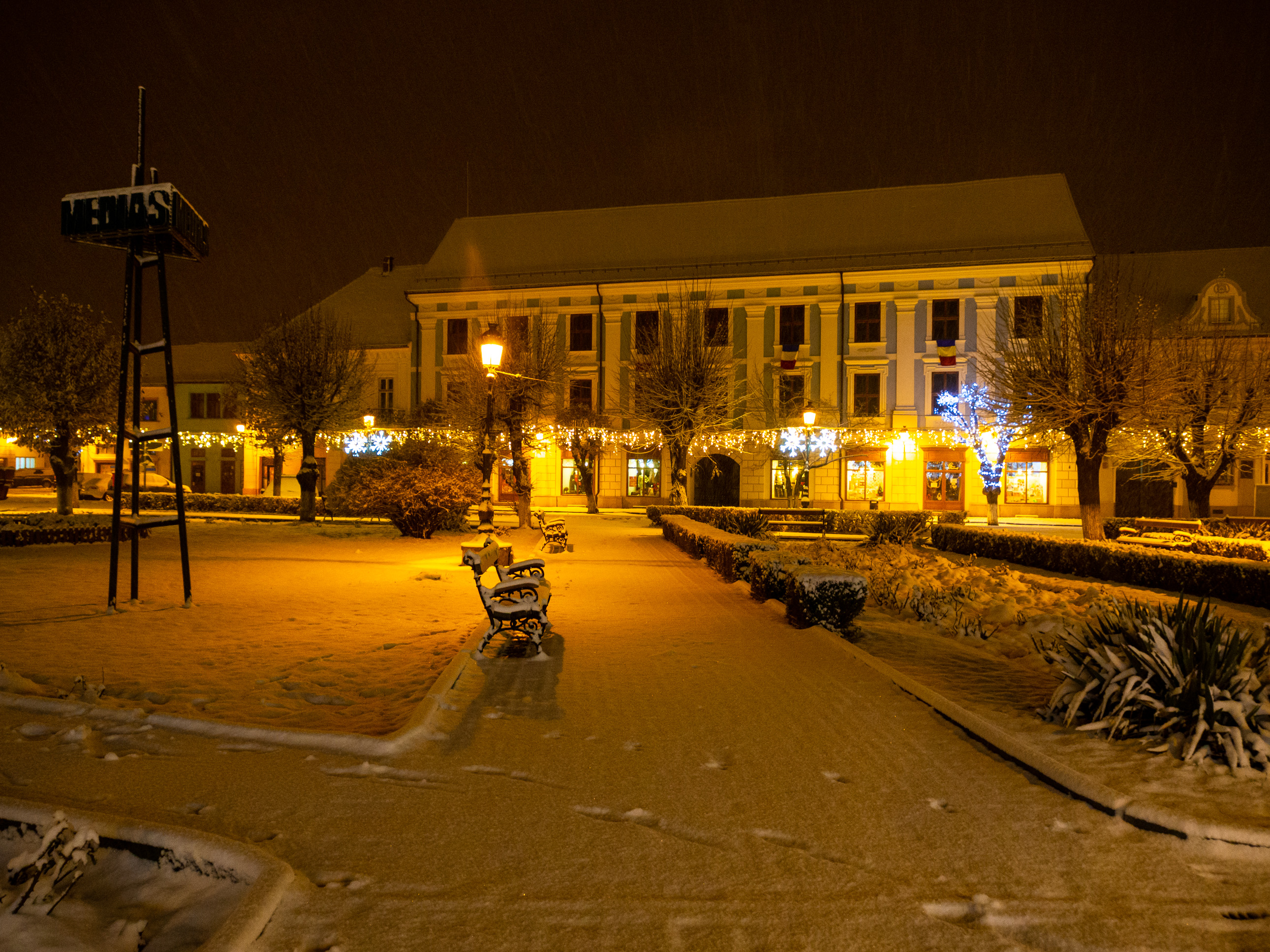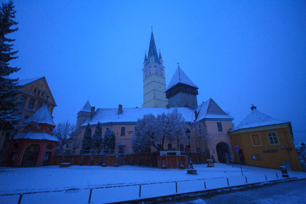 A dawn walk through the historic town center in Medias, Transilvania, Romania