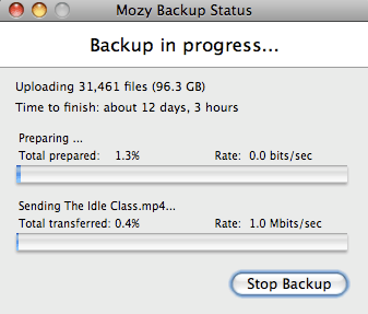 In the end, in order to get any sort of progress with the Mozy backups, I reduced my backup set to 1GB. That’s right, 1GB, which allowed me to back up my Address Book, iCal, and Application Preferences, plus some documents. Then, and only then, did Mozy manage to complete the backup jobs in time.