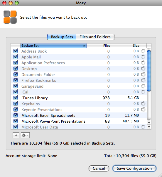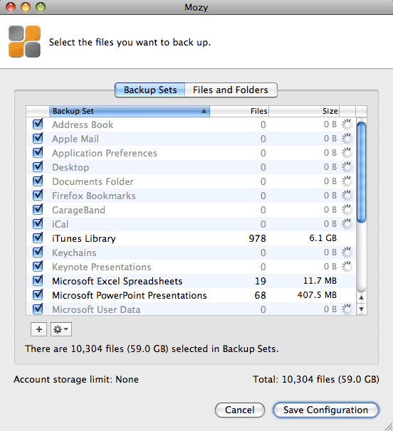 I then reduced my backup set even more, down to 59 GB (see below), hoping this would speed things up. It would have still taken a ridiculous amount of time to back up my data, and I only ended up getting frustrated with Mozy’s software in general, because of its poor design. Every time I wanted to configure the backup set, I needed to wait for the software to finish calculating the aggregate size for all file types, and that could take half an hour or more every time I opened that panel. Couldn’t they have cached this data when the operation was performed the first time?