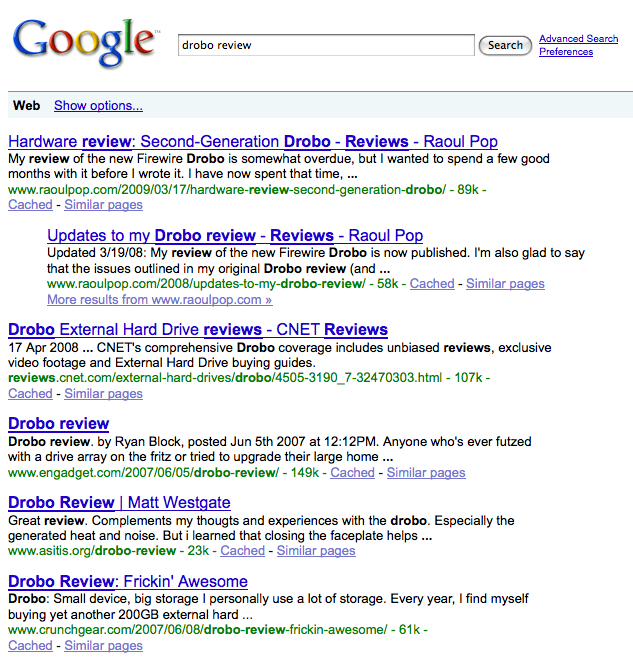 A couple of days ago, I noticed an increase in the traffic to my Firewire Drobo review, most of it from search engines, so I did a quick search on Google for the phrase “drobo review“, which is what people were using to find me. To my surprise, my review was the first search result that came up! I’d been in the #2 spot for a long time, just under CNET, for the same phrase, but now, without having made any changes to my review since I’d written it, I ranked first.