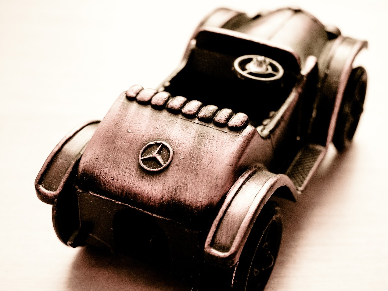 Classic Mercedes cabriolet, a toy car made of bronze, macro.