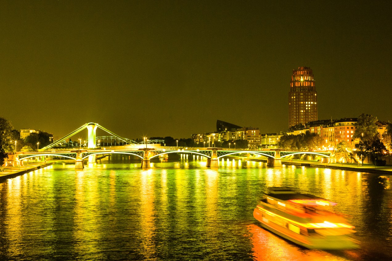 A long exposure of the River Main at night gives it an icy appearance. A boat motors its way into the foreground from bottom right, while one of the bridges over the river is well lit for the upcoming Oktoberfest.