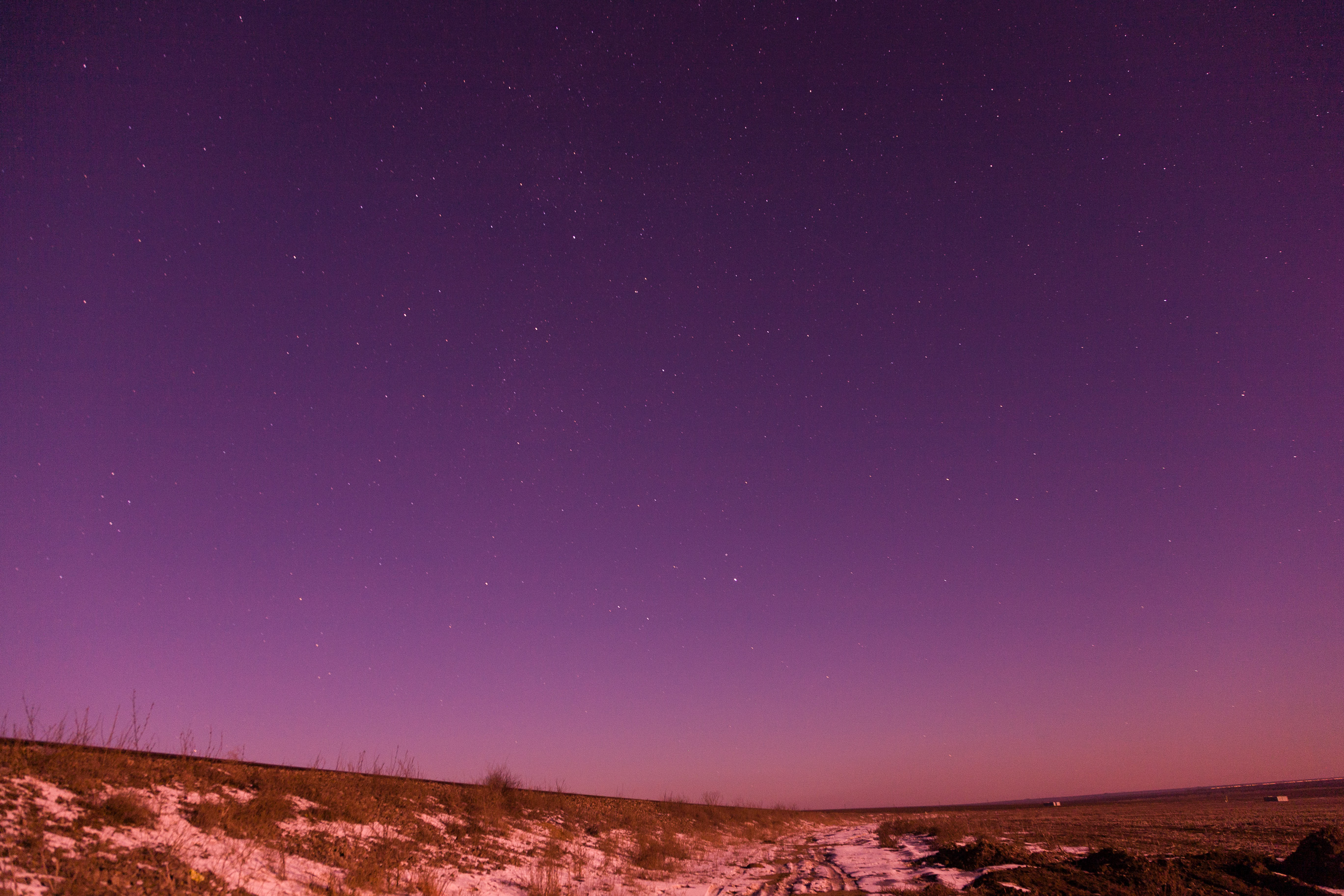 Outside the village of Cogealac, in Dobrogea, Romania. The night sky is clear, full of stars, and there’s a full moon to boot, which is why the ground is so well lit. The ground swells up to my left is for the railroad, which passes by the village on its way to Constanta.
