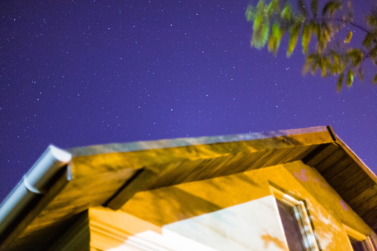 Long night exposure showing the awning of a house set against a starry blue sky. The ghost of a green branch is visible in the upper right corner. Tulcea, Romania.