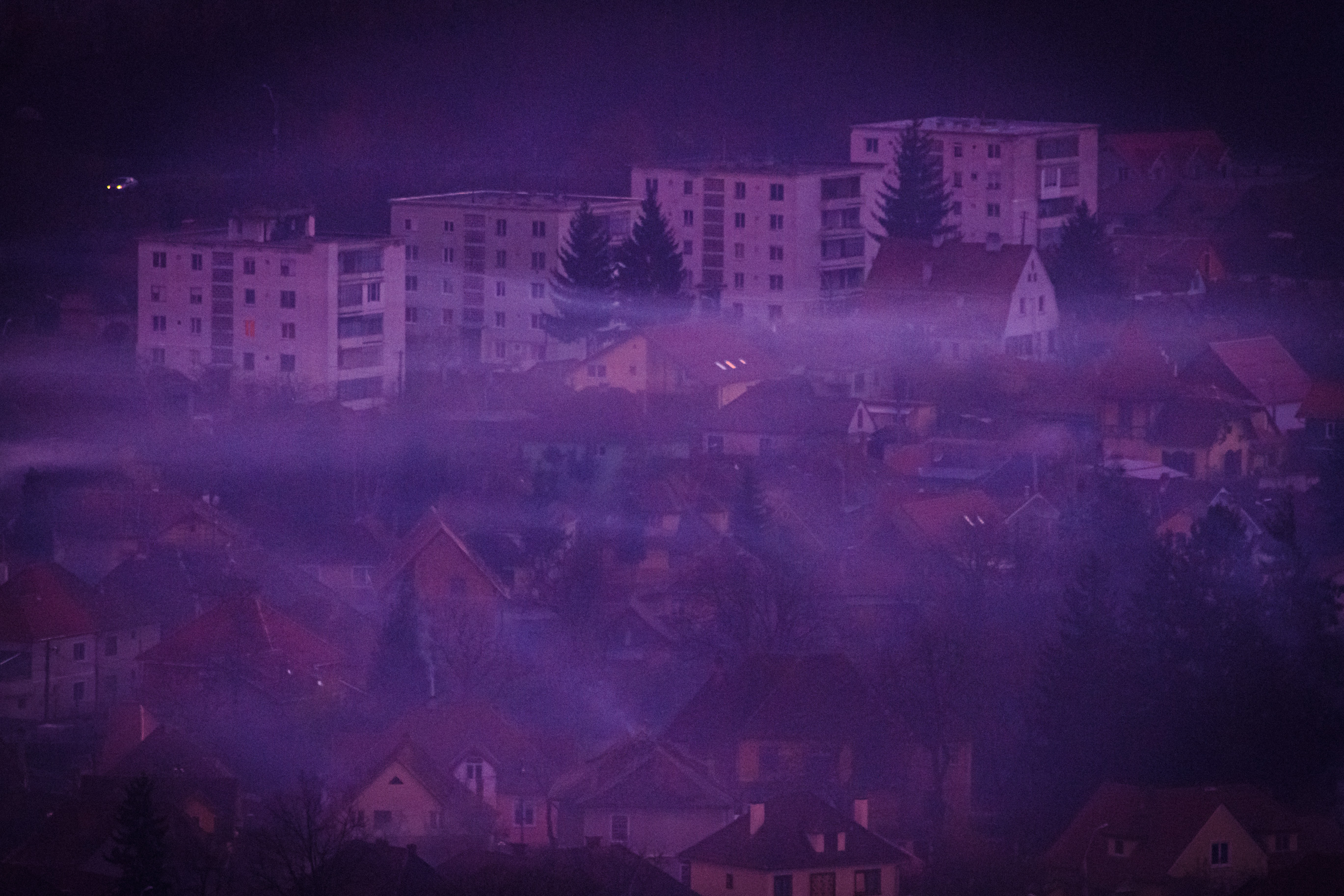 Fog sets in at twilight over the city of Sighisoara, Romania.