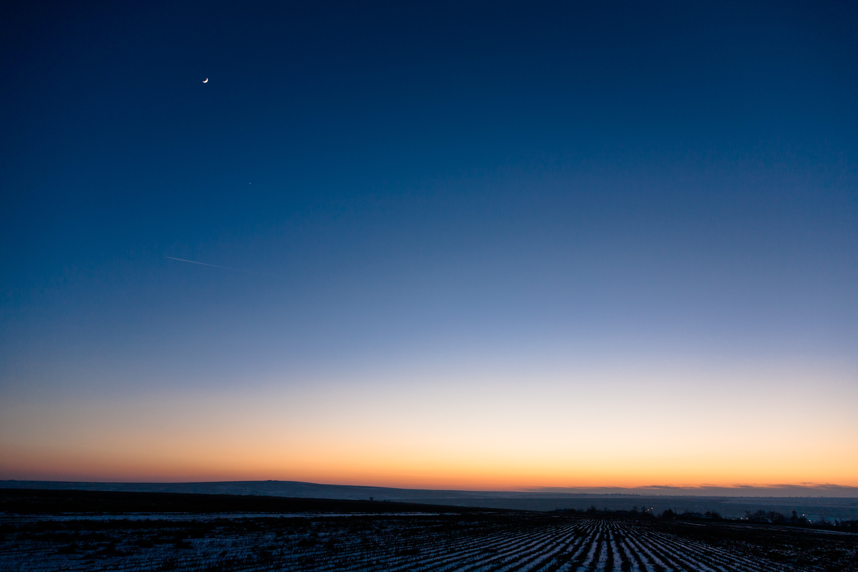 The sun has gone below the horizon, the semilune is up, and the field would be eerily quiet but for the howling wind. Photo taken somewhere near Cogealac, in the province of Dobrogea, Romania.
