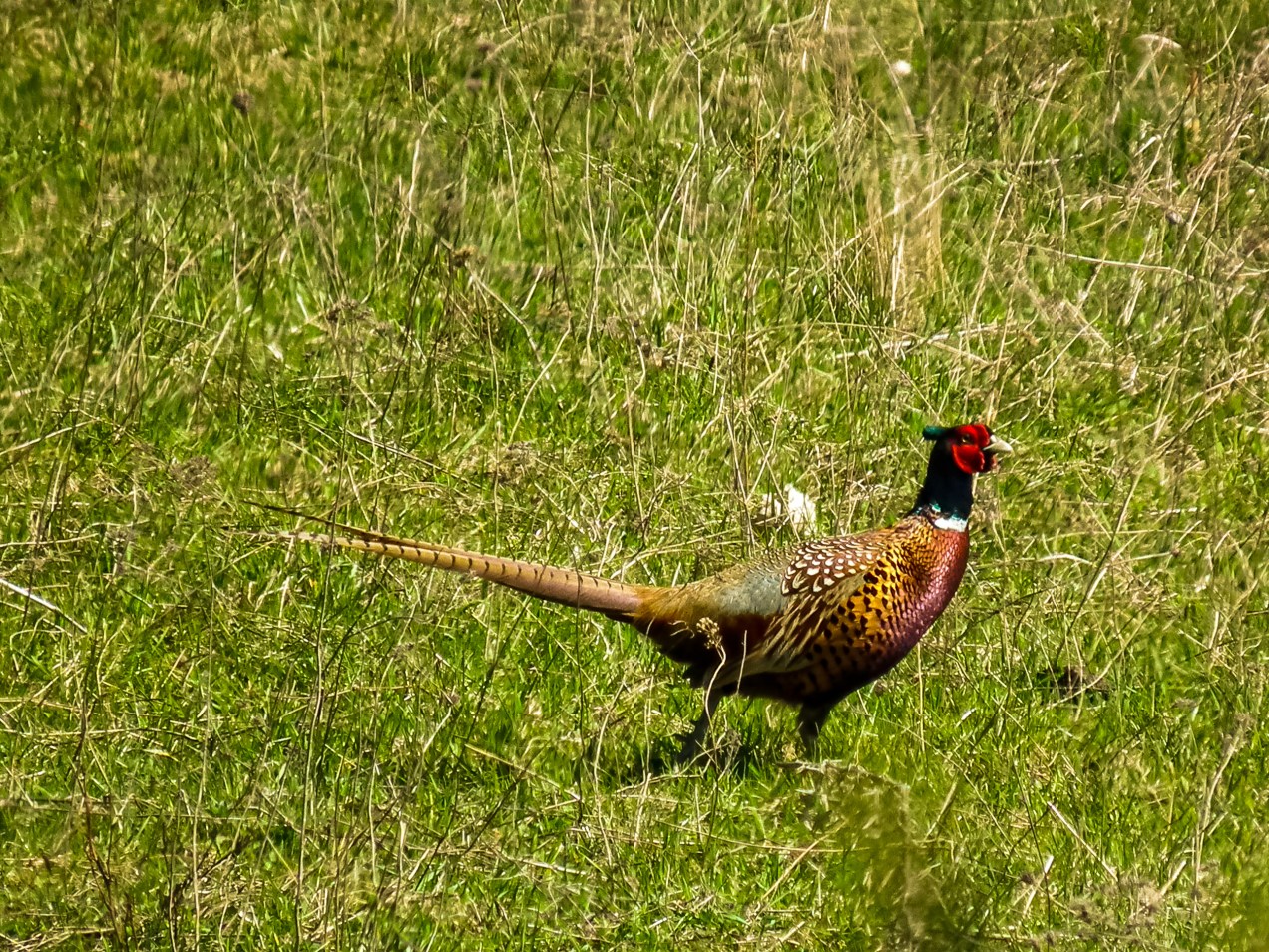 A male wild pheasant walks about on a hillside, somewhere near Viisoara, Romania.